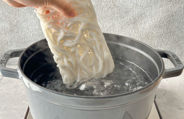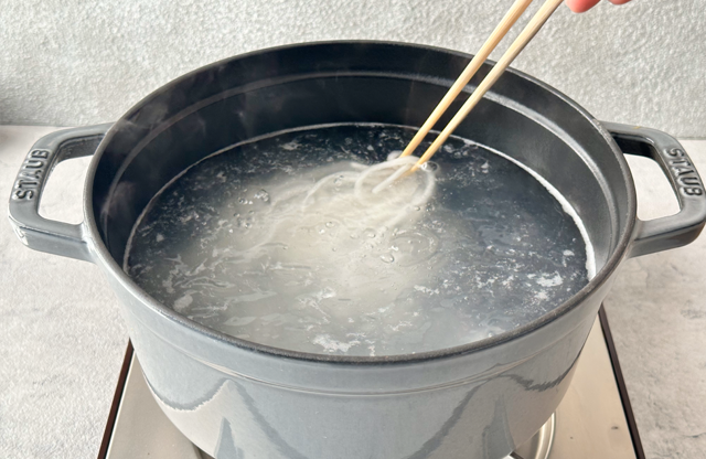 麺が湯の中で自然に解れるまで待ちます。